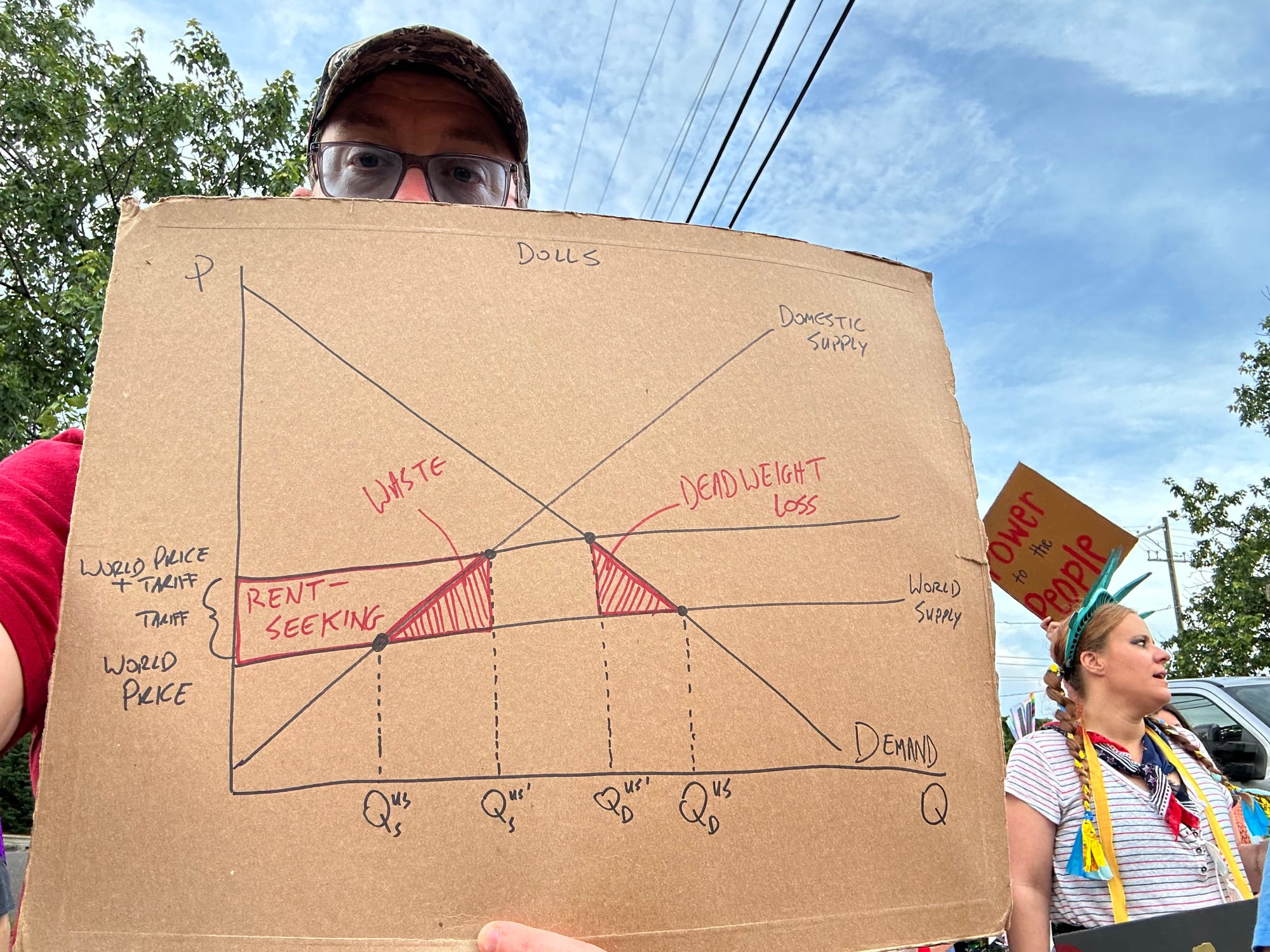 I wasn't planning to go, but some friends said they were going. So we made signs and joined in. As I've told everyone, the best thing about this sign is that I can use it again when the Democrats are back in power. Protectionism, sadly, is a bipartisan indulgence.